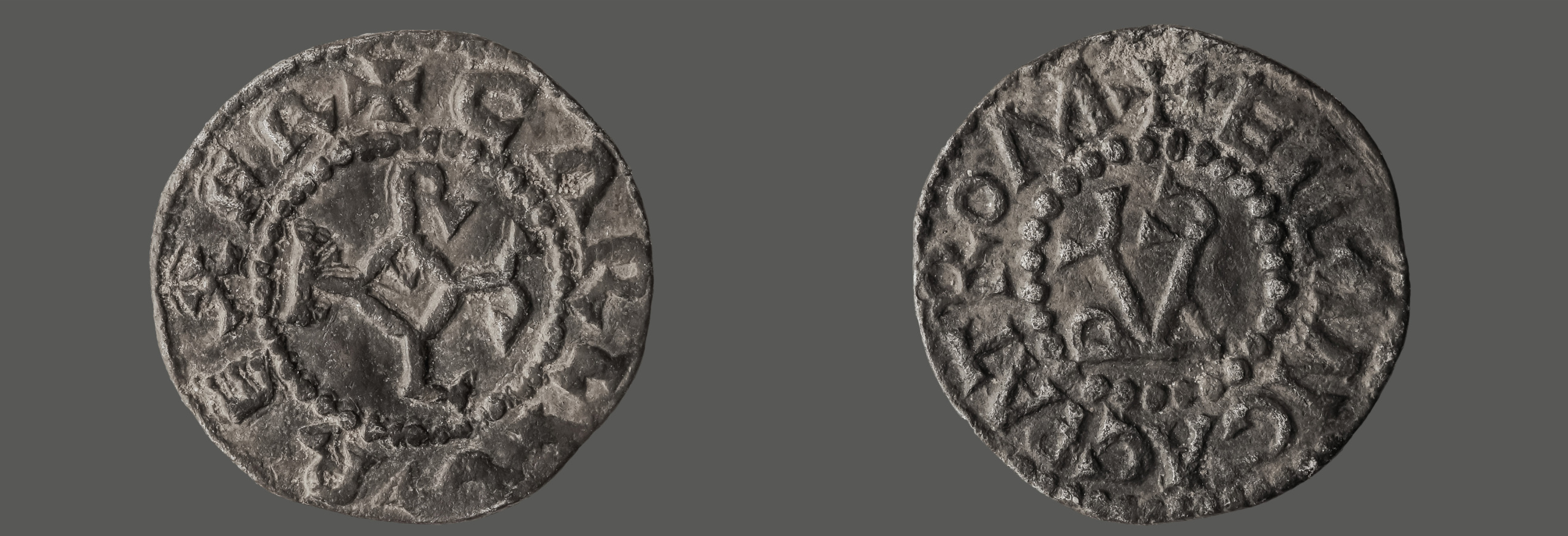 Umschrift CARLVS REX FR zeigt auf der Vorderseite das lateinische, auf der Rückseite das griechische Monogramm des Herrschernamens.