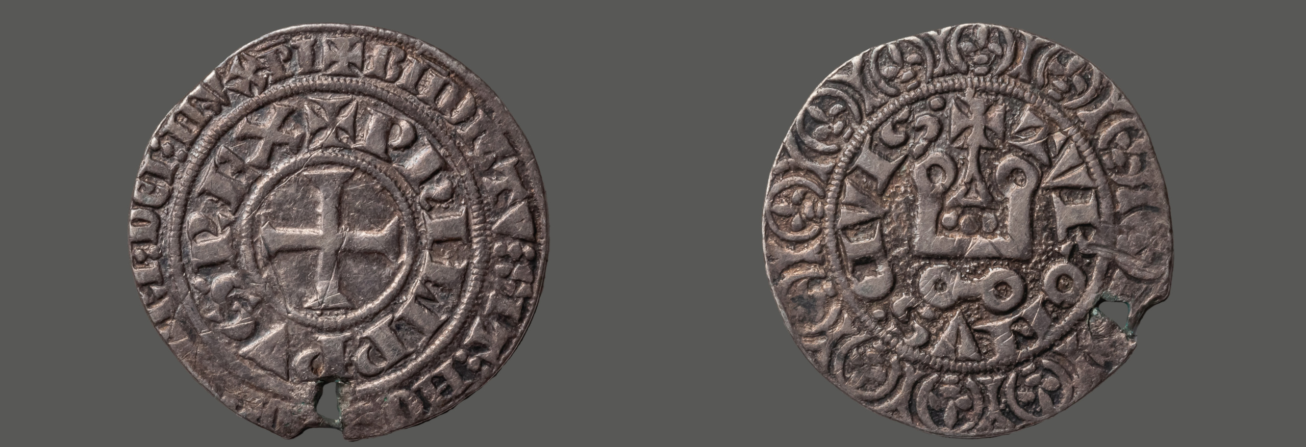 Philippe IV., genannt „der Schöne“, war ein König aus der Dynastie der Kapetinger. Frankreich machte er zur europäischen Großmacht und entriss dem Heiligen Römischen Reich deutscher Nation zahlreiche Gebiete. Er zwang den Papst, seinen Sitz ins Exil nach Avignon zu verlegen und verbot den Templerorden. Wie seine Vorgänger ließ er Turnose prägen, Silbermünzen, die deutlich größer waren als der Denar. Auf der Schriftseite weisen Turnose zwei Kreise mit Inschriften auf. Die französischen Silbermünzen waren im Rheinland im täglichen Geldverkehr sehr beliebt. Philippe IV. le Bel