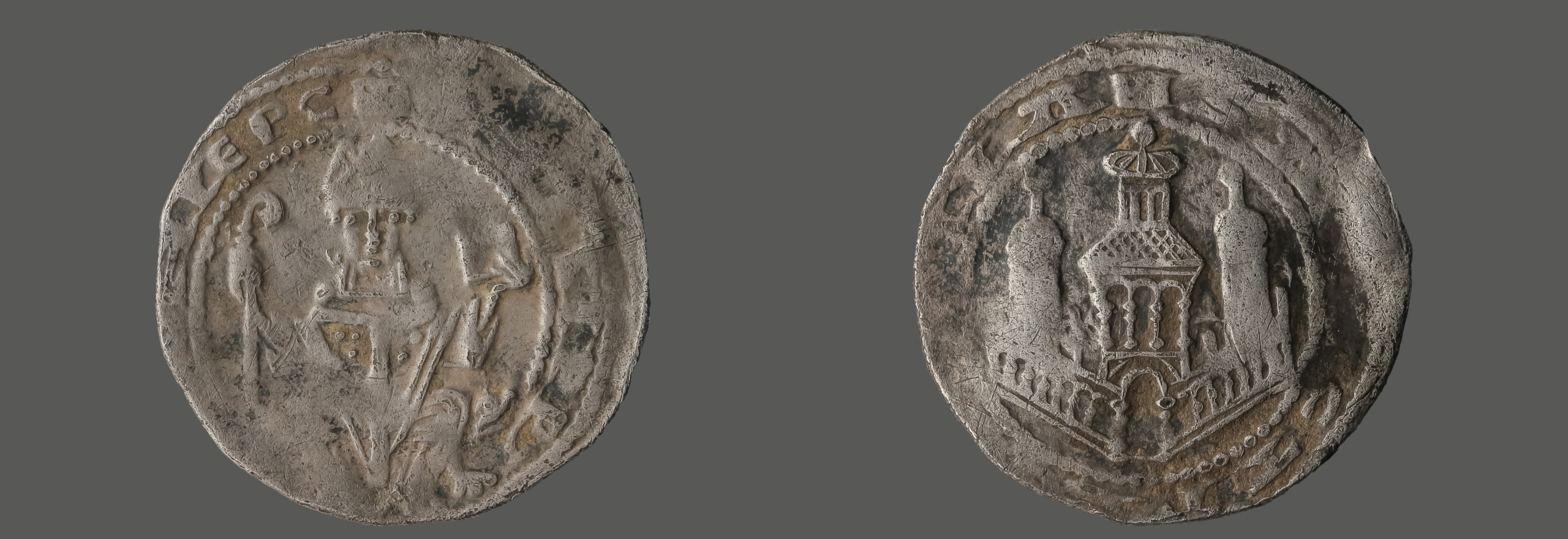 Der Denar zeigt auf der Vorderseite den Erzbischof mit Mitra, Pallium, Krummstab und Messbuch, auf der Rückseite eine Stadtmauer mit drei Türmen.